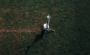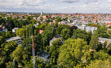 Atmospheric measurement tower above treetops with a city skyline in the background
