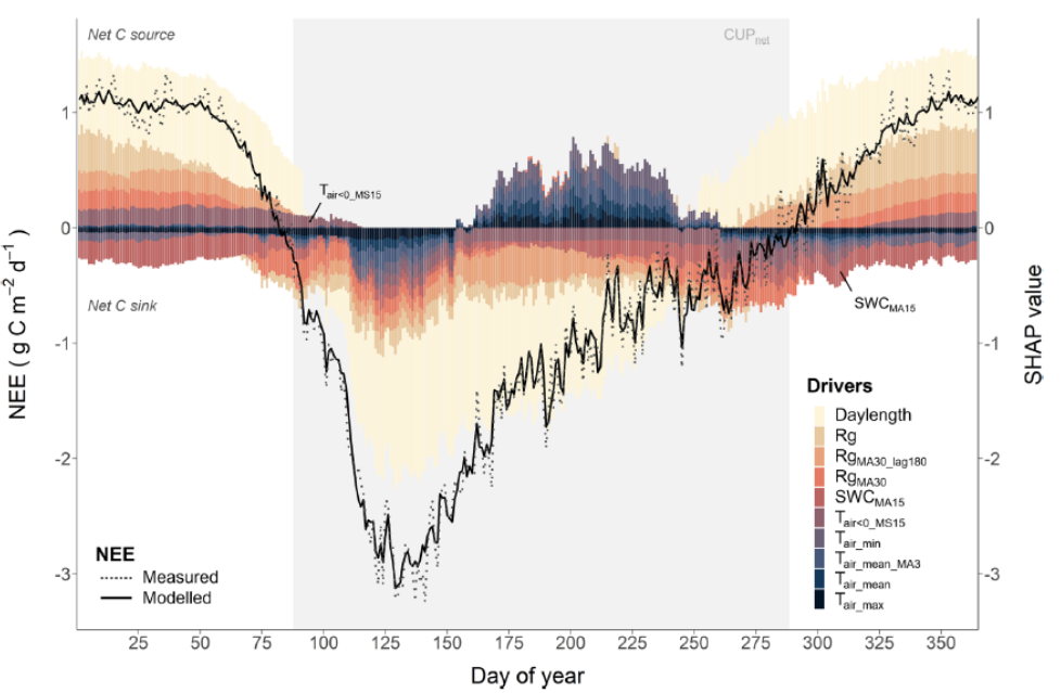 Davos was labelled as ICOS Class 1 Ecosystem station in 2019, but carbon dioxide fluxes have been measured at the station since 1997, and high quality environmental data were available as well. “These data were crucial for our analyses. We combined them with sophisticated machine learning approaches, in particular with “SHAP” (SHapley Additive exPlanations) analyses, which allowed us to determine not only the most relevant drivers but also how driver contributions changed over time. We found that the spruce forest in Davos benefited from higher temperatures between autumn and spring, with higher net carbon uptake during favourable conditions and reduced carbon loss when winter photosynthesis compensated respiration. However, the high summer temperatures increasingly limited NEE over time. This can make it difficult for this subalpine spruce forest in the future.”