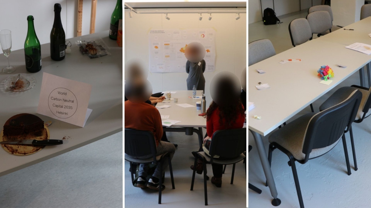 The second scene happened two years after. Helsinki had achieved the goal of becoming the World Carbon Neutral Capital and the dashboard had been developed into a live tool. The group celebrated the success of the project discussing the further possibilities of the dashboard and different ways to collaborate further with different parts of the city and its stakeholders. The organisers had created a real celebratory atmosphere with actual sparkling drinks and chocolate cake.